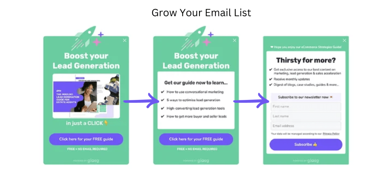 When users click, the second step elaborates on the offer, giving a sneak peek into the guide’s valuable content—like tips on conversational marketing, optimizing lead generation, and tools for boosting conversions. This highlights the benefits and encourages users to keep engaging.