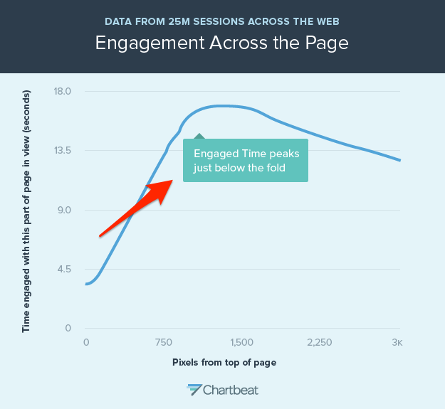 The data analyzed from Chartbeat of 25 million users across the web suggests that web engagement peaks right after the visitor scrolls below the fold.