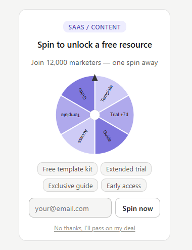 Used by SaaS and content brands where prizes are entirely non-monetary. The gamified format makes a content upgrade feel more exciting than a plain email gate — no discount budget required.