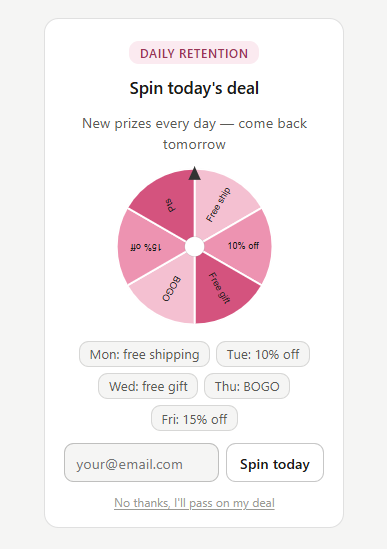 Takeaway: Recurring engagement mechanics turn the wheel from a one-time conversion tool into a habitual brand touchpoint that brings visitors back daily.