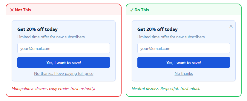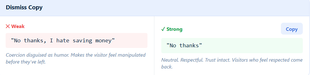 Even your “no thanks” matters more than you think. If it sounds guilt-driven or negative, it creates friction instead of trust. Keep it neutral and respectful so visitors feel comfortable engaging again later.