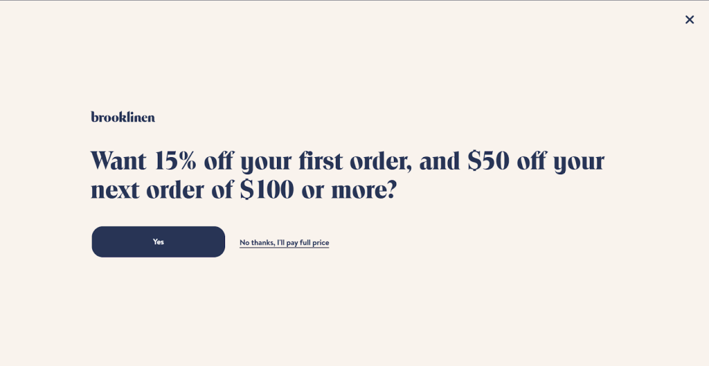Brooklinen uses a two-step popup sequence to first hook visitors with a bold discount, then capture their email in step two. This structure filters out passive clickers and produces a higher-quality list.