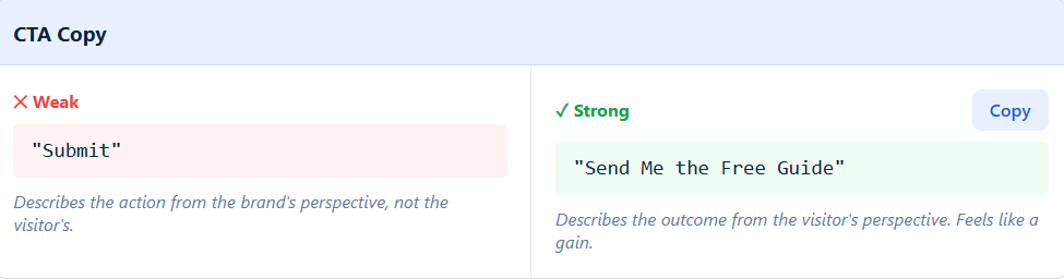 Your CTA isn’t just a button, it’s the final push toward action. If it sounds bland or brand-focused, it won’t motivate clicks. Shift the language to highlight what the visitor gains, not what you want them to do.