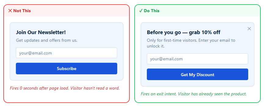 This is the fastest way to lose a visitor. When a popup shows up the moment someone lands, it feels intrusive instead of helpful. A better approach is to wait, observe behavior, and then step in with something relevant.