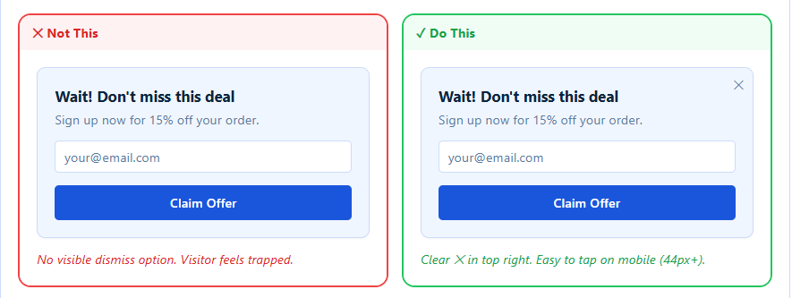 Nothing frustrates users faster than feeling trapped. If someone can’t easily dismiss your popup, they’re more likely to leave your site altogether. Good UX always gives control back to the visitor.