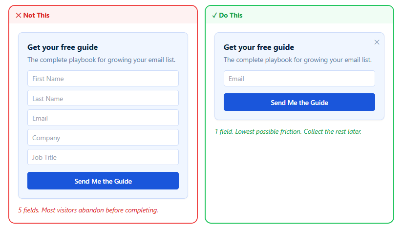 - A single email field makes the form fast to complete. Every extra field reduces conversions.