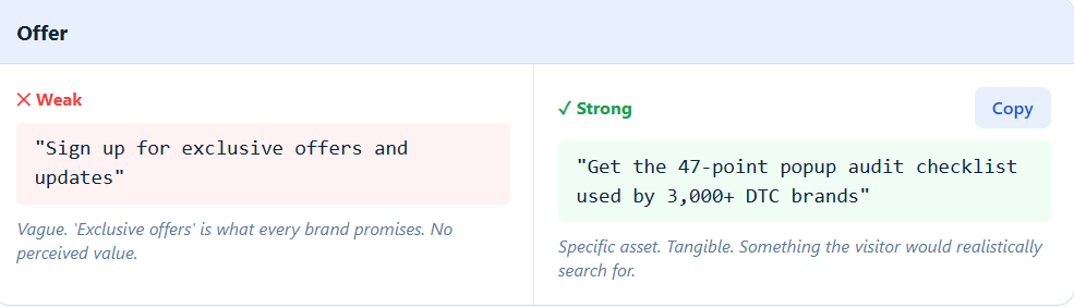 A weak offer blends in with everything else online. If it feels like something every brand says, it won’t stand out or convert. Make your offer specific, tangible, and easy to understand so it feels worth the exchange.