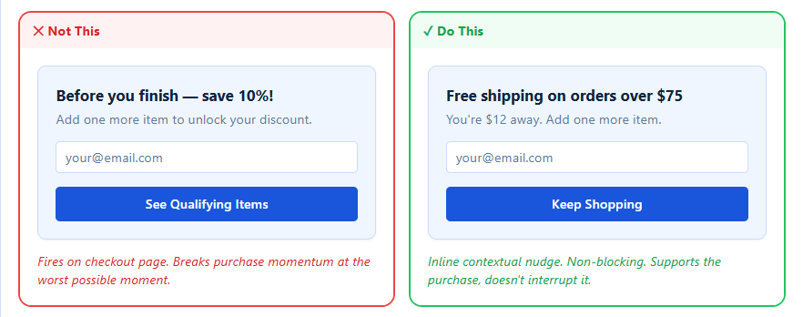 Why it matters: Checkout is the highest-intent moment in your funnel. A popup here should reduce friction, not create it; otherwise, you risk losing the conversion.