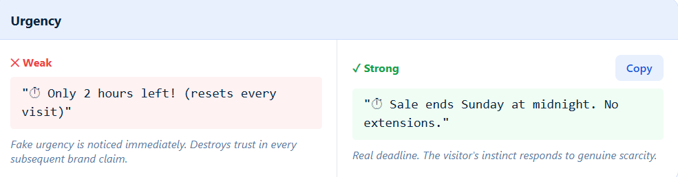 Urgency works only when it feels real. If visitors sense fake countdowns or recycled scarcity tactics, it can hurt trust. Use urgency sparingly and only when there’s a genuine reason to act quickly.