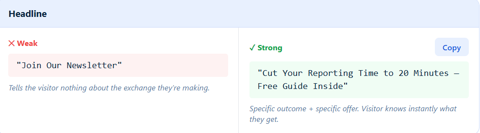 - Headline communicates the value before the visitor can dismiss